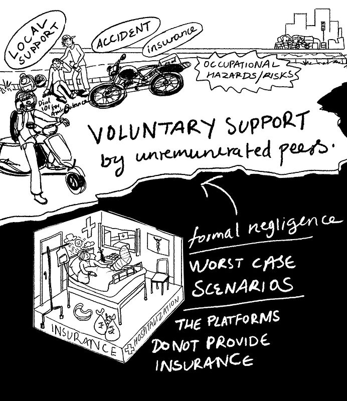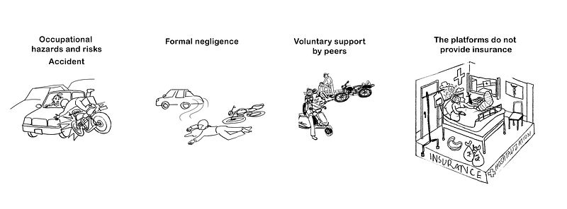 This collaborative project seeks to illustrate digital platform workers' experiences during and beyond the COVID-19 pandemic. The representative illustrations here are based on Indian app-based drivers' own retelling of their lived experiences rendered in collaboration with Anusha Menon, who is a graphic illustrator based in Pune. These illustrations will be collated in the form of a Zine and made available alongisde academic publications from the project. Please click on any image below and cycle through the gallery to view them in full size.